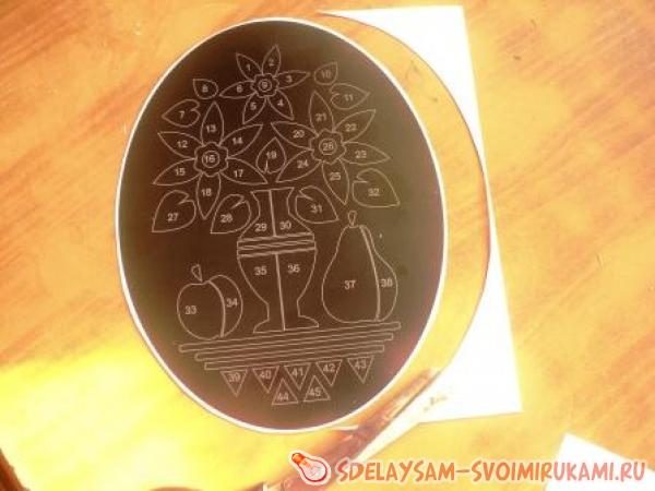 3. Из глянцевой цветной бумаги вырезают овал и наклеивают его на лист картона. На цветном фоне при помощи светлого воскового мела рисуют изображение, помечая детали цифрами, соответствующими ранее подготовленным элементам. Рисунок не должен быть очень сложным, а детали лучше делать крупными.