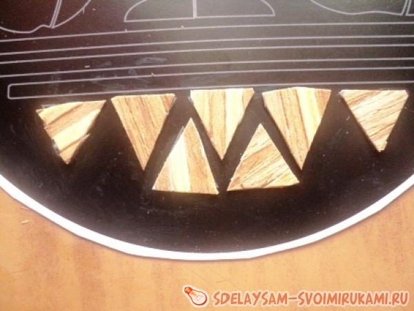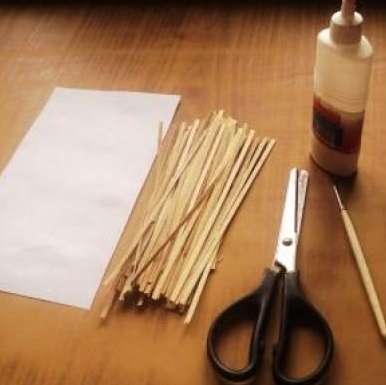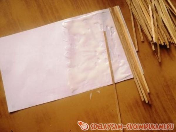 1. Картон покрывают тонким слоем клея при помощи кисточки, а затем на поверхность выкладывают полоски шпона вплотную друг к другу. Получившуюся пластину выравнивают, используя ножницы.