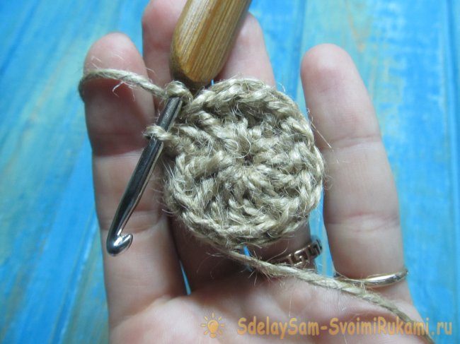 2. Начинаем вязать нашу корзину из джута. Делаем колечко. Из него необходимо связать 14 столбиков с накидом. Это будет первый ряд. Должна получиться ровная окружность.