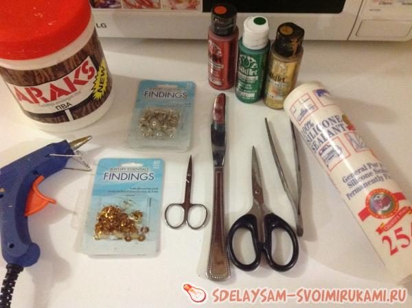 Красить лучше акриловой краской металлик не кисточкой, а губкой, слегка прикасаясь к коже. На фото три цвета красок: золотая, бронзовая, бирюзовая. С начала нанесите золотую с изнаночной и лицевой стороны, потом местами бронзовую, а на листок и бирюзовую. Краска быстро сохнет, металлик придаёт свежесть и блеск. Что даёт изделию вечерний нарядный вид.