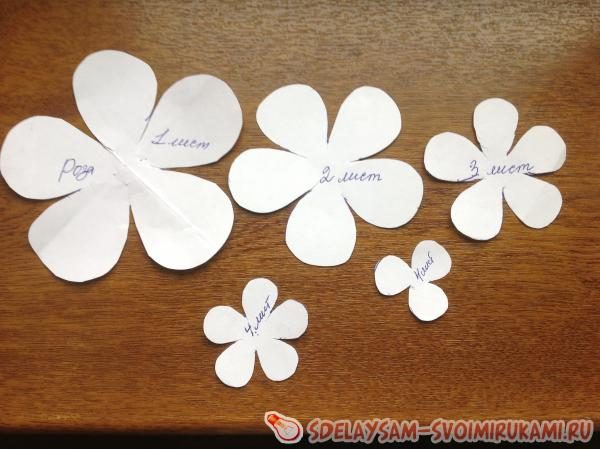 Подобрать кусочки кожи и сделать выкройки цветов на бумаге, как показано на фото.