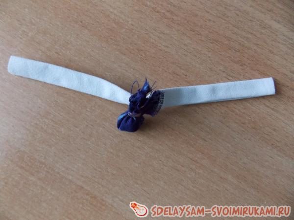 Перевязываем под шариком нитками и, оставив небольшую длину, отрезаем лишнюю ткань. Из цветной полоски делаем повойник на голову куклы: складываем полоску сначала сторонами к центру, затем пополам. Надеваем получившуюся узенькую полоску на голову куклы и перевязываем в районе шеи нитками.