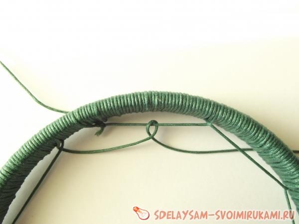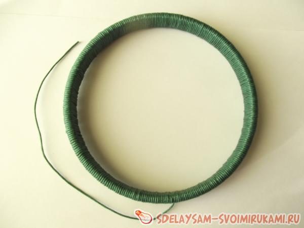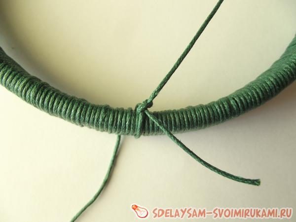 К кольцу, взятому за основу амулета, нужно крепко привязать длинный шнур, оставив около 20 другого края свободным для крепления бусин и перьев. Начинайте плотно обматывать нить вокруг основы, стараясь не оставлять промежутков между оборотами. Желательно, чтобы нить не обрывалась в процессе. Обмотав всю основу, крепко привяжите нити к шнуру, оставленному в начале работы. Все узелки можно смазывать прозрачным быстросохнущим клеем, чтобы укрепить их.