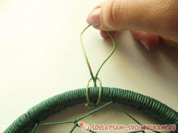 Затем близко к узелку следует привязать начальную нить, которая будет оплетать амулет. Чтобы начать первый ряд паутины, отступите 3-4 сантиметра от начала нити и сделайте петлю: оберните обруч в направлении часовой стрелки и проденьте нитку в образовавшееся отверстие, плотно затянув ее. Продолжайте делать аналогичные петли по кругу. В процессе изготовления ловца снов в паутинку можно вплетать деревянные бусинки, ракушки, при желании закрепляя их узелками.