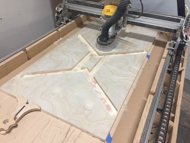 Материал для шпонок был сделан из склейки листа ореха между двумя листами махагони, а станок с ЧПУ вырезал форму. Еще я сделал шаблон, который поможет вырезать пазы для шпонки с помощью ручного фрезера.