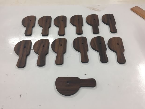 Вставки из поликарбонатного листа были подготовлены с помощью станка с ЧПУ и торцевой фрезы. Здесь мне нужно было принять решение, как более надежно зафиксировать пластиковые вставки на дне столешницы. Мне хотелось, чтобы их легко можно было снять, например, для замены из-за царапин. Я решил, что флажки-фиксаторы, выполненные из ореха, будут в самый раз. Поэтому я вырезал их лазерным резаком из имеющегося у меня материала.