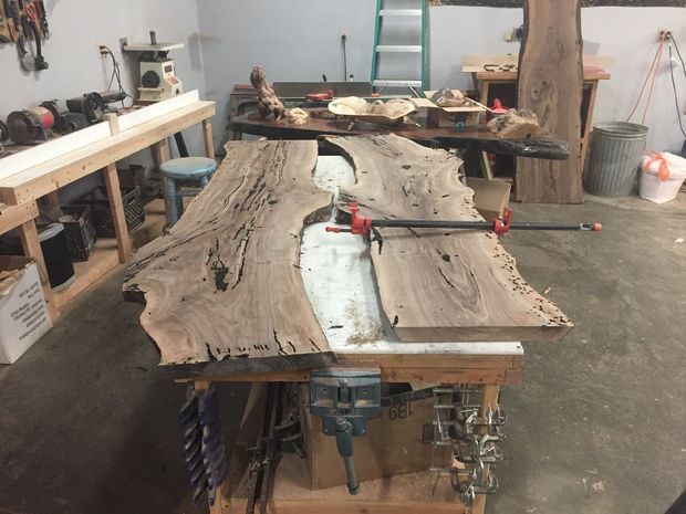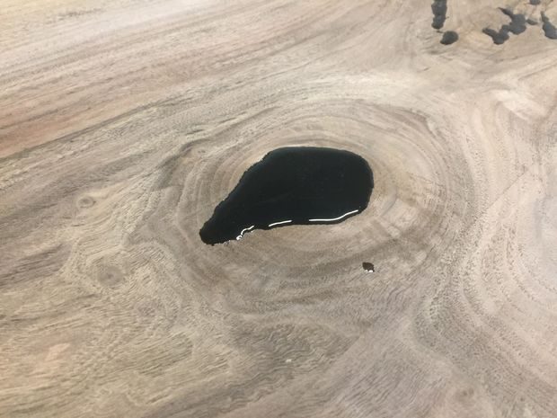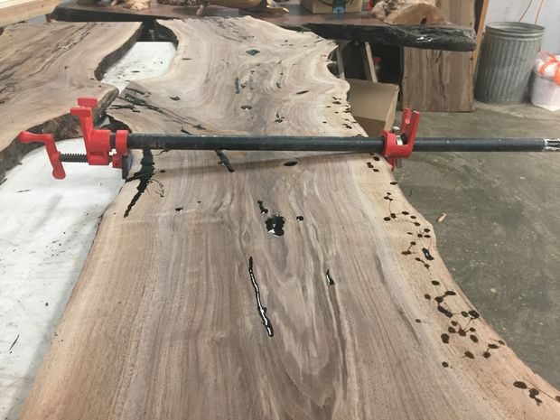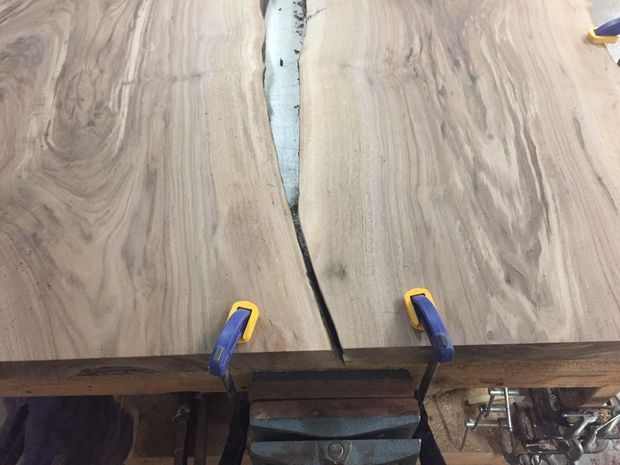 В большинстве случаев мне нравится, когда все сучки, трещины, пустоты фиксируются и заполняются черной эпоксидной смолой, особенно при работе с орехом. Черный цвет чаще всего выглядит естественно, а иногда придает контрастность. Так как в досках то тут, то там были довольно глубокие трещины, я использовал смолу с долгим временем застывания; это позволит ей хорошо впитаться и поможет действительно зафиксировать трещины, а не создать иллюзию заполнения. Недостаток этого метода в том, что почти всегда приходится снова наносить смолу второй, а бывает и третий раз. Иногда для повторной обработки я использую смолу с быстрым временем отвердения. Я заполнил все пустоты на обеих сторонах досок, чтобы их можно было надежно фиксировать. Наносить эпоксидную смолу лучше с «горочкой», чтобы при шлифовке не обнаружились пузыри (так они поднимутся выше плоскости доски).