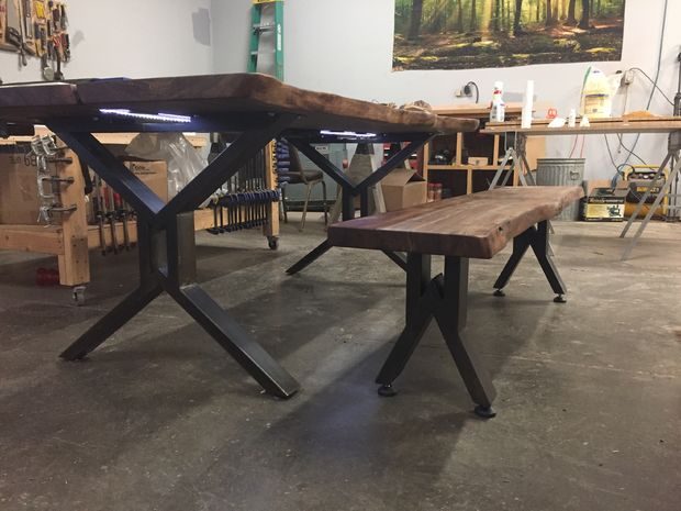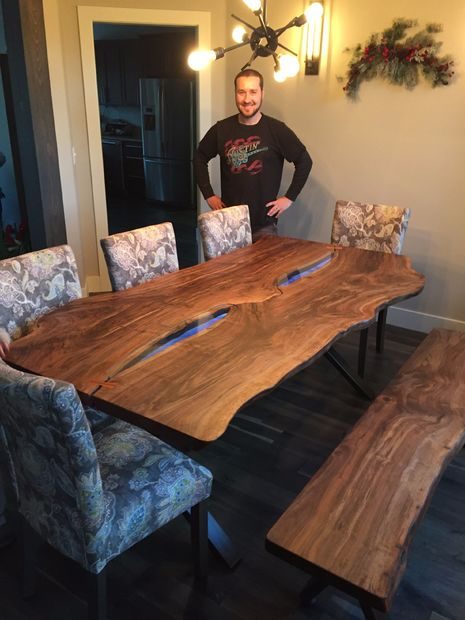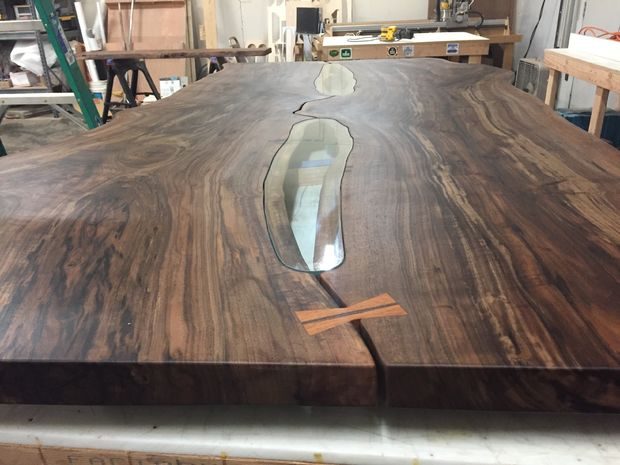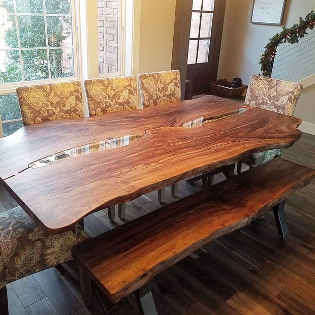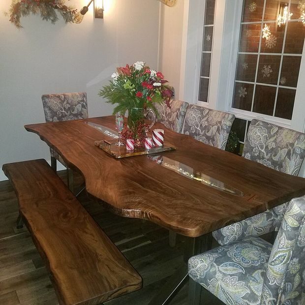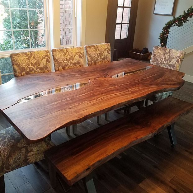 Сделанный на заказ обеденный комплект из ореховой доски с не обрезными краями, светодиодной подсветкой, стеклянными вставками и металлическими ножками.