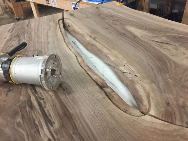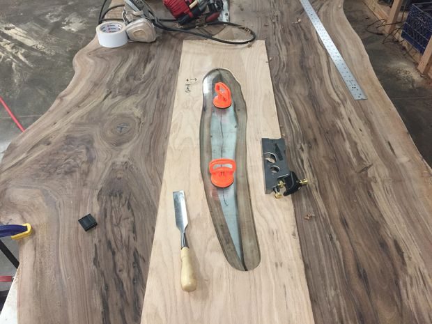 После выравнивания шва между досками, я зафиксировал их к столу при помощи струбцин. Затем, используя шаблон, я фрезером вырезал пазы. Там, где фрезер оставил паз округлым мне пришлось поработать стамеской. Можно было сделать «ласточкин хвост» с округлением, но мне нравится вид ровных углов.