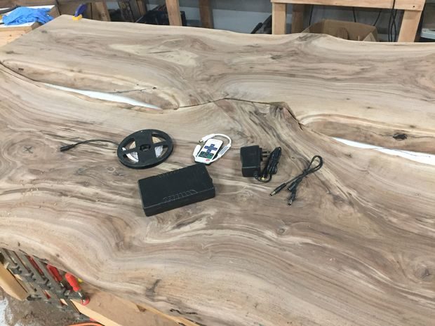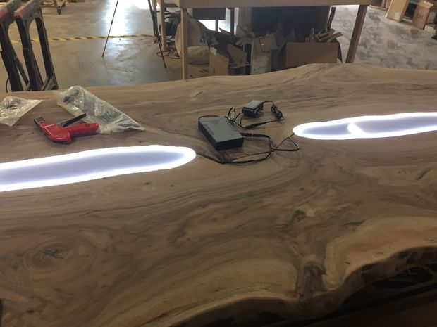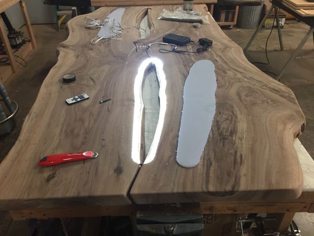 Прежде чем вставлять пластик, мне нужно было разобраться со светодиодной подсветкой. Для более изысканного эффекта я решил разместить LED-освещение по периметру пластика. Этот прием еще поможет скрыть провода. Я приобрел тонкую светодиодную ленту с клеящейся стороной, которую можно легко приклеить по углублению, которое я делал ранее вокруг нижней части полости. Я должен был собрать две отдельные электрические цепи в виде Y, которые затем должны входить в отдельный диммер. Диммер с одной стороны соединяется с аккумуляторной батареей и с другой с 12-вольтовым блоком питания. Это позволяет лампам светиться как от батареек, так и от сети. Идея заключается в том, чтобы хозяева подсоединяли зарядное устройство, когда не пользуются столом, и можно было бы убирать провода, когда они им будут мешать. Провода и батарея были закреплены на дне столешницы при помощи хомутов и анкеров. Я рассматривал вариант встраивания батареи и проводов в дерево, но окончательно решил, что лучше не стоит, так как все эти компоненты когда-то придется заменять. В конце концов этот стол должен стать семейной ценностью, которая переживет меня, клиента и светодиодные лампы. Говорят, что LED-лампы могут служить довольно долго, но, если возникнет желание, их можно будет заменить на что-то подобное.
