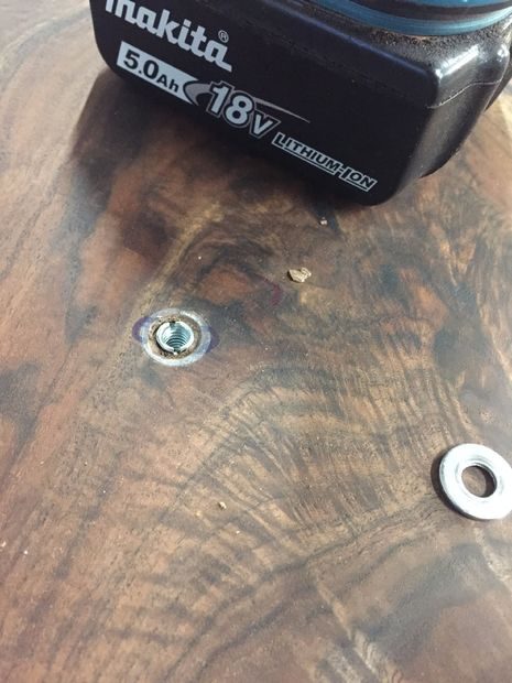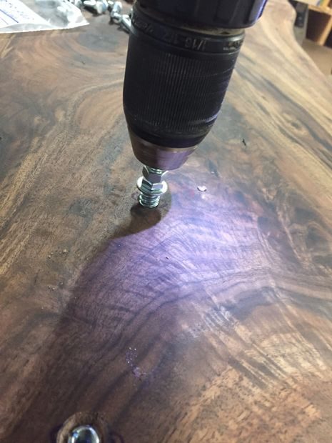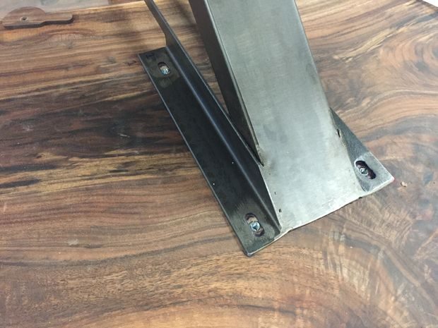 По завершению сварочных работ, я обработал все металлические поверхности угловой шлифмашиной с лепестковым диском, чтобы у них была однородная фактура и блеск. В угловом металле я вырезал продолговатые отверстия для крепления столешницы, чтобы в случае сжатия или расширения древесины не возникло никаких проблем. Нижние части ножек я заварил железными пластинами, чтобы потом просверлить в них отверстия и установить механизм регулировки высоты.