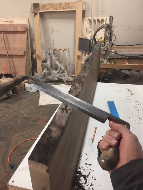 Прежде чем взяться за инструмент, почти каждый мой проект начинается с разработки дизайна в системе автоматизированного проектирования (САПР). С необработанными краями это сделать немного сложнее, так как трудно добиться их повторения в САПР. Я решил проблему поставив высокую лестницу и сделав фото досок по всей длине. Потом импортировал снимки в программу и обвел контуры. На фотографии была видна измерительная лента, чтобы более точно масштабировать графику.