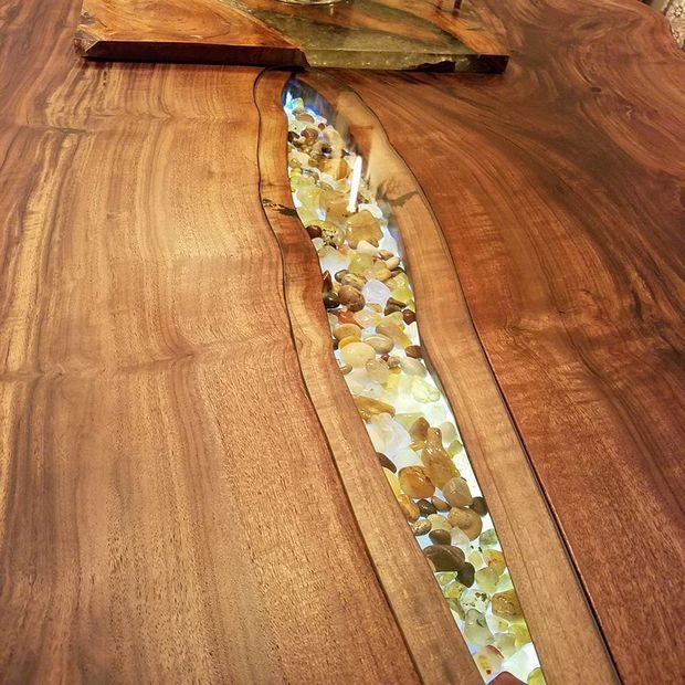 Заказчице обеденный комплект очень понравился, и теперь в освещаемых выемках лежит ее коллекция агатов, посередине стоит букет по сезону, а вокруг специально подобранный набор стульев. Это есть на фотографии. Стол может придать оживление и без того милому помещению. Я рад, что это творение попадет в прекрасный дом, где им будут любоваться и заботиться о нем.