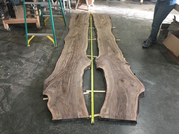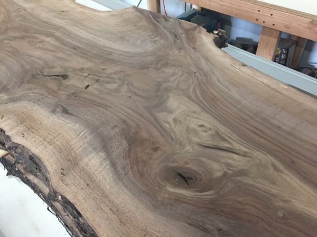 Наконец я нашел то, что мне было нужно в местном магазине. Не совсем в магазине. Оказалось, что у его владельца есть собственная пилорама и склад, на котором полно досок с необрезными краями. У него было несколько штабелей ореха из которых можно было сделать выбор. Здесь я и нашел то, что искал. У досок была идеальная ширина, выпилены из одного бревна (сохранялась симметрия), сушились в правильных условиях на протяжении 3-х лет, красивые и плоские, а цена была относительно недорогой. К ним прилагался бонус. Так как их обработали широким рубанком, то мне не нужно было устранять шлифованием неровно выпиленную поверхность. У меня нет рубанка шириной в 60 см…