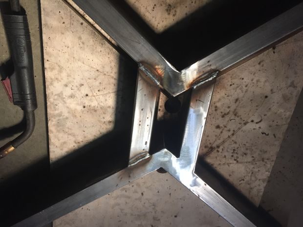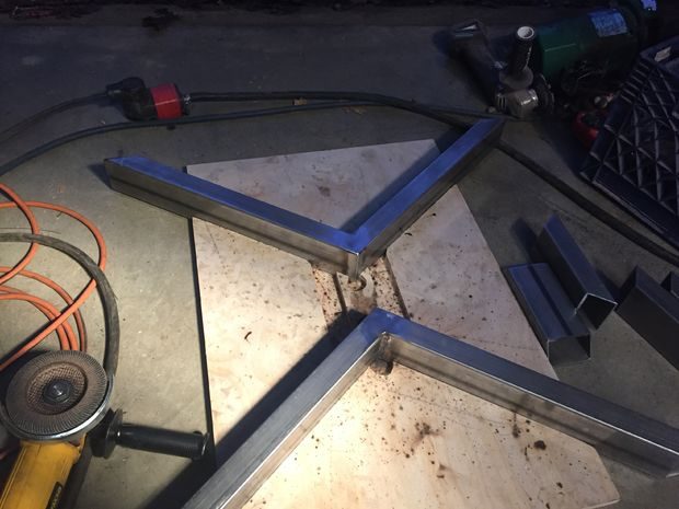 Ножки делались из прямоугольной стальной трубы размером 3,8 х 7,6 см и 3,8 х 3,8 см железного уголка. Чтобы облегчить процесс, я вырезал лазерным резаком шаблоны для фиксации необходимых компонентов и заготовки, которые помогут все сложить под правильным углом. Давным-давно я был прекрасным сварщиком, но шли годы и без достаточной практики у меня все еще остались функциональные навыки, но варить декоративными швами я разучился. Чтобы сгладить этот недостаток, я воспользовался угловой шлифовальной машиной, чтобы сточить излишки металла и придать поверхности более аккуратный вид.