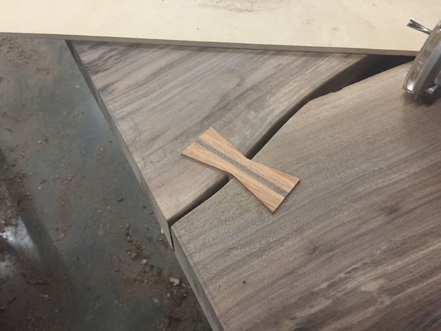 Когда пазы для шпонки были готовы, я осторожно попробовал вставить «ласточкин хвост» (чтобы убедиться, что он не застрянет!) и приступил к склеиванию. Шпонки были сделаны немного толще, чем пазы, поэтому были зашлифованы вровень со столешницей.