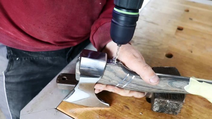 По форме фрезеровок на топорище вырезаем из алюминиевых остатков 2 накладки. Отверстия в алюминиевой полосе развертываем и помещаем в них стальные штифты.