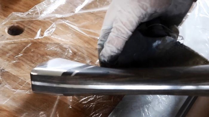 Готовое топорище, включая алюминиевые накладки и полоски, покрываем пропиткой для дерева с водоотталкивающим эффектом и втираем тканевой салфеткой.