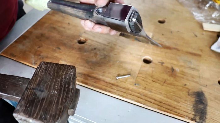 Вынув стальной клин, снимаем со старой рукояти головку топора.