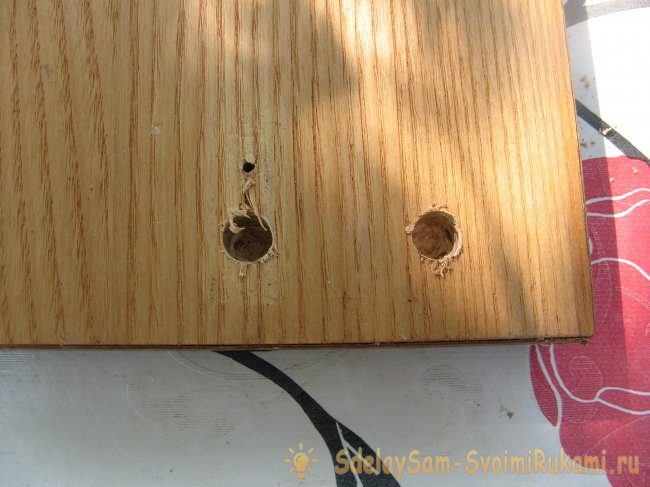Сверлим в ней отверстия под гайки. Тоже не сквозные. Нужно быть осторожным в данной процедуре. Ножки у стола толстые и в них сверлить проще, а тут можно разогнаться и продырявить столешницу.