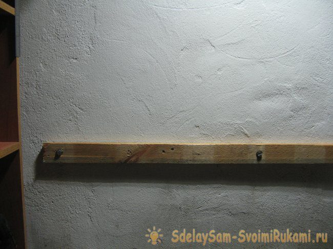 Прикручиваем брусок к стене на саморезы, предварительно установил шайбы.