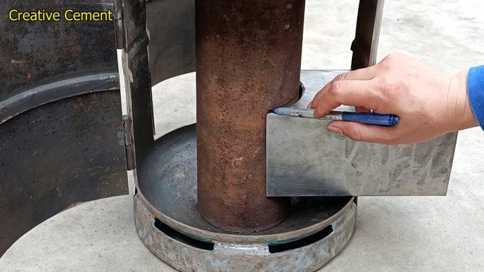 Теперь берем толстостенную стальную трубу 125 мм, и обводим вверху баллона. Затем по этому контуру вырезаем отверстие.