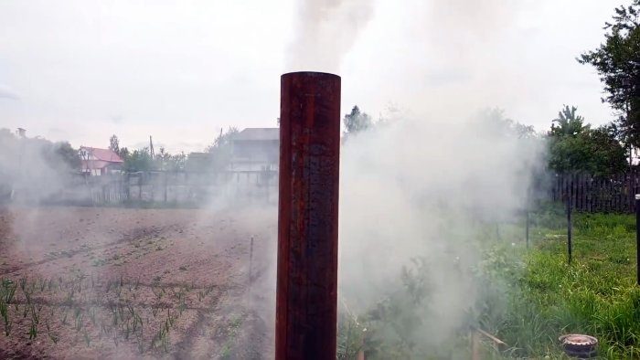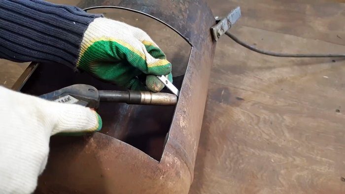 С противоположной от дверцы стороне части газового баллона ближе к верху вырезаем круглое в плане отверстие, к которому привариваем «колено» из трубы диаметром 108 мм для установки дымовой трубы.
