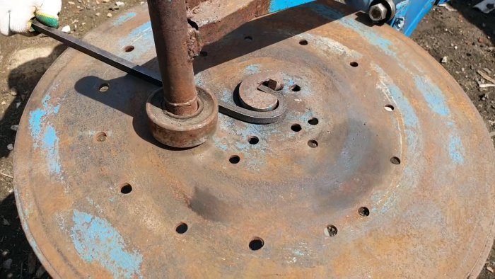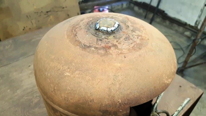 Для удаления резьбового кольца горловины распиливаем ее поперек болгаркой и выламываем с помощью долота. Отверстие в баллоне завариваем металлическим пятаком.
