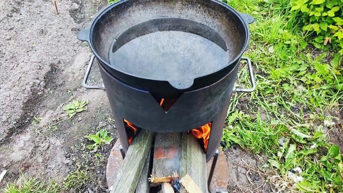 Простейшая печь под казан не имеет дверцы, трубы и поддувала. Ее легко изготовить с минимальными затратами. Дым выходит через специальные отверстия сверху печи и дверной вырез. Несколько повышенный расход дров из-за отсутствия регулировки тяги.