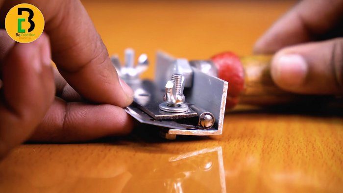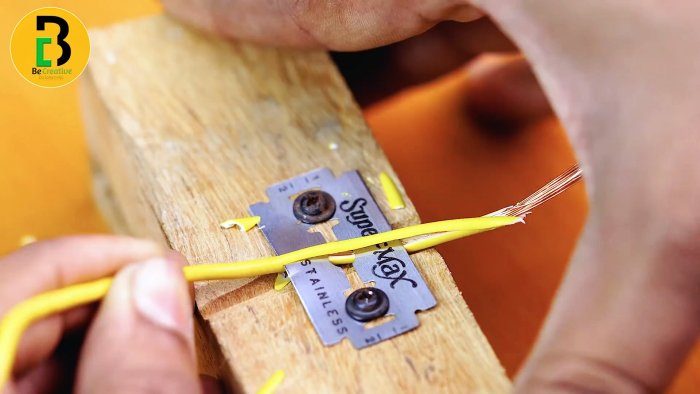 На желоб прикручивается двумя саморезами лезвие от безопасной бритвы. Теперь протягивая под ним провод, мы можем срезать с него изоляцию. Сделав несколько таких желобов разной глубины, сможем зачищать провода любого сечения.