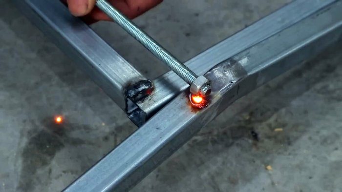 От концов длинных заготовок, где поперечина приварена заподлицо, отмеряем по 36 см и ставим метки. На концы шпильки заданной длины наворачиваем по гайке, укладываем гайки на метки и привариваем их к заготовкам.