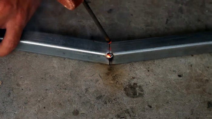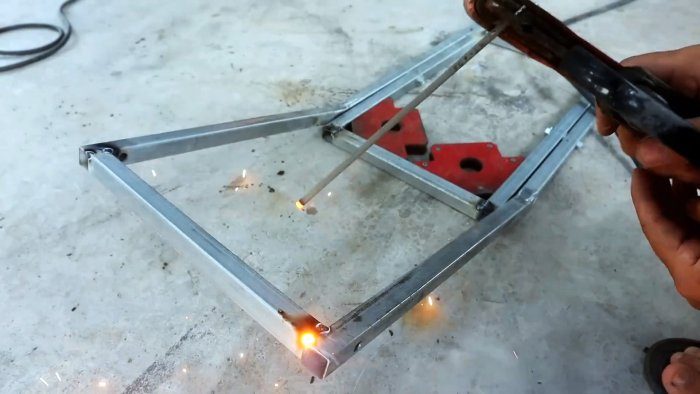 Стыкуем короткие и длинные отрезки по наклонным торцам и завариваем стыки. Швы зачищаем болгаркой. Соединяем заготовки из профильной трубы между собой с помощью болтов, гаек и шайб.
