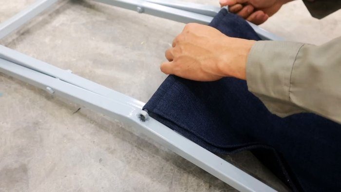Концы прочной ткани перебрасываем через поперечные элементы каркаса стула и закрепляем с помощью подгибки к стойкам спинки и сидения шпильками, пропущенными через подгибки на боковых срезах ткани.
