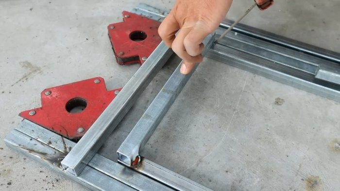 От свободных концов длинных отрезков отмеряем 10 см и проводим поперечные линии. Укладываем на линии в поперечном направлении отрезок длиной 35 см и привариваем его к наружным отрезкам длиной по 45 см, обеспечивая прямые углы в местах соединения с помощью магнитных уголков.