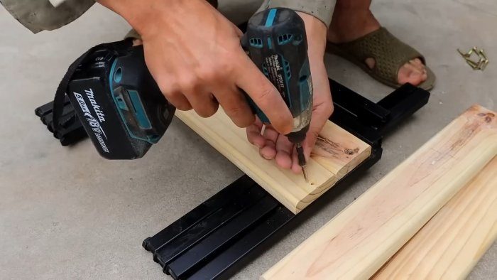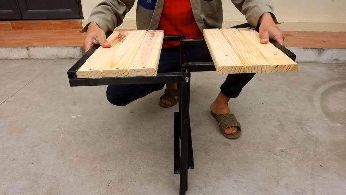 Прикручиваем к металлическому каркасу саморезами деревянные элементы сидения, предварительно просверлив в них по краям отверстия. Стул легко раскладывается, обладает достаточной прочностью и жесткостью, просто собирается, и при этом занимает мало места.
