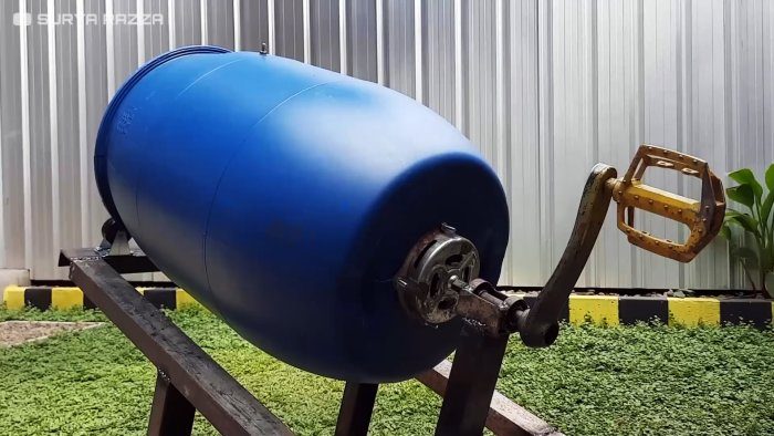 В качестве смесительной емкости используем толстостенную пластиковую бочку расчетных размеров. В ее дне просверливаем отверстия для крепления металлического фланца, который крепим болтом к внутреннему торцу оси узла вращения, а с другой ее стороны – шатун с педалью от велосипеда.