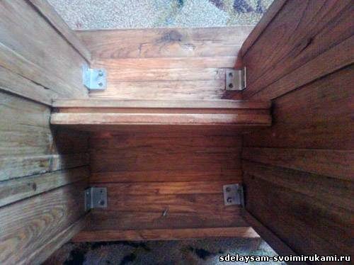 Осталось только все это собрать! Для этого с обратной стороны крышки просверливаем 4 отверстия. В эти отверстия мы будем вставлять ножки. Соответственно в ножках делаем такие же отверстия. После чего берем деревянные нагеля, намазываем их клеем и вставляем в отверстия на ножках. Теперь можно смело соединять ножки с крышкой. Для лучшего скрепления прикручиваем с каждой стороны по два уголка.
