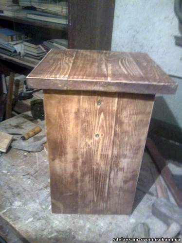 Теперь все это дело необходимо зафиксировать, чтобы дать нашей заготовке скрепится. Способов фиксации очень много, но мы разберем только два. Если в вашем домашнем арсенале имеются зажимы или струбцины, то вам очень повезло. А что делать тому, у кого их попросту нет. Здесь придется проявить смекалку! Лично я делал все очень просто. Одну сторону упирал в стену, а к другой прибивал деревянный упор, который и не давал нашей заготовке шевелиться. Как видите, все очень легко. С другой ножкой проделываете все те же операции, которые описаны выше и оставляете их в таком положении примерно на сутки. Теперь переходим к крышке. У нас имеется четыре детали по 32 см. Одну из них мне пришлось отрезать вдоль, чтобы получился квадрат 32см*32см*32см*32см. Потом это все опять склеивается, равняется и закрепляется в неподвижном состоянии до завтрашнего дня. Повторяем все сказанное и с последней нашей заготовкой. Все, на сегодня баста! Итак, вы приходите домой и видите результат своей работы: