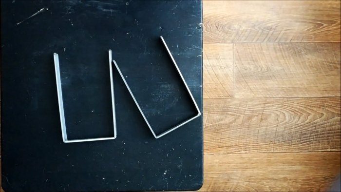 Затем из тонкой полосы нужно изготовить две П-образные скобы. Они послужат кронштейнами для крепления светильников. Для облегчения процесса, на перегибе их можно просверлить.