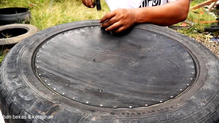 Вырезанный из ленты круг прибивается к оставшемуся целому борту покрышки короткими гвоздями с шагом 10 мм.
