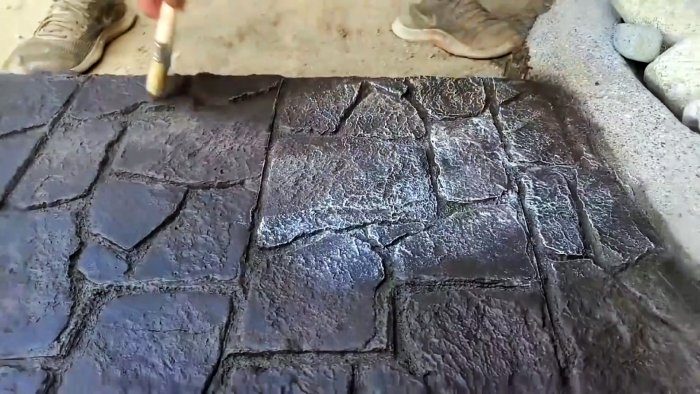 Его нужно уложить с любого угла и вдавить в бетон. Затем вся поверхность проштамповывается подряд до конца. Если бетон начинает прилипать, то необходимо снова смочить форму.