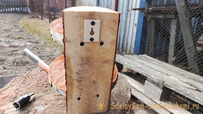 Пластмассовый держатель, который мы ранее вырезали из пластины, прикрепляем поверх углубления, с внутренней стороны основания.