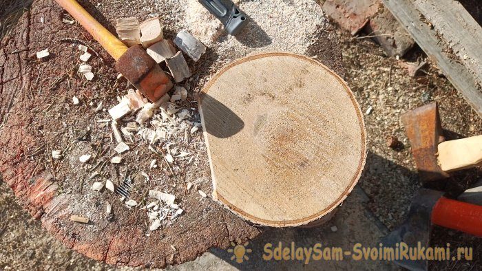 Их можно отыскать на даче. Если у Вас нет дачи, можно поинтересоваться у знакомых и друзей. Не стоит сразу бежать с топором в лес и рубить дерево. Во-первых, это незаконно. Во-вторых, свежая и сырая древесина нам не к чему. Нужны только сухие поленья. При помощи пилы отделяем от чурки не слишком толстый спил. Миллиметров 20. Такой же по толщине спил делаем от чурки меньшего диаметра. В конце самое тонкое полено, миллиметров 100 в диаметре, распиливаем напополам вдоль, и укорачиваем до 25-30 мм. Вот так должно получиться: