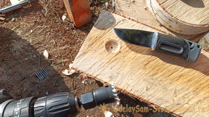 Далее, при помощи дрели, коронки и ножа, с обратной стороны вертикального спила делаем углубление, миллиметров 10 вглубь.