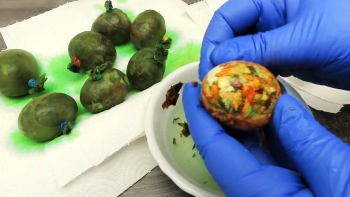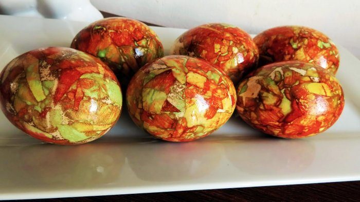 В результате крашеные яйца приобретут мозаичный узор с двухцветными прожилками и вкраплениями. Краситель не испортит продукт и не снизит срок его годности.