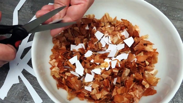 Нарежьте шелуху лука и бумагу кусочками по 1 см – от формы будет зависеть финальный рисунок. Смешайте заготовки.