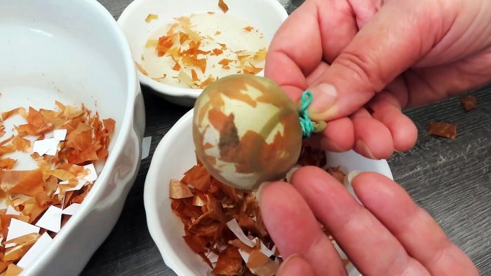 Перед варкой вымойте яйца и оставьте их влажными для липкости. Каждое обмакните в конфетти из лука и бумаги, поместите в чулочный «пакетик» и стяните края резинкой, чтобы содержимое не выпало.