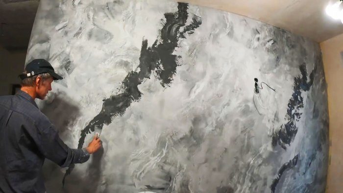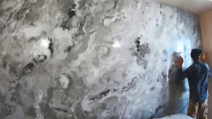 Затем маленьким шпателем 3 состава набираются на большой шпатель. В итоге стоит провести им по стене, и 3 цвета будут смешиваться, давая интересные разводы.