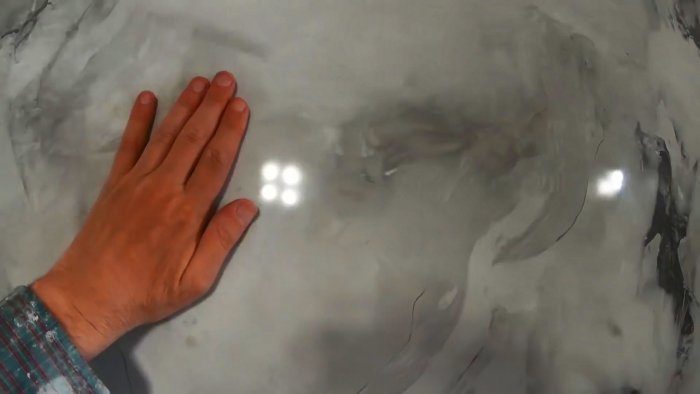При высыхании штукатурка светлеет, поэтому первоначальный контраст сойдет. Третьим слоем наносится еще более темная штукатурка, чтобы делать резкие переходы между разводами, как на настоящем мраморе. Если местами слой получился толстым, то лишнее снимается шкуркой до того, как вести по нему свежим составом.