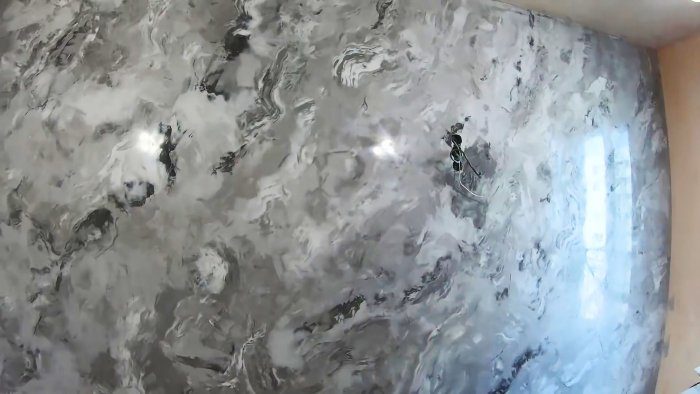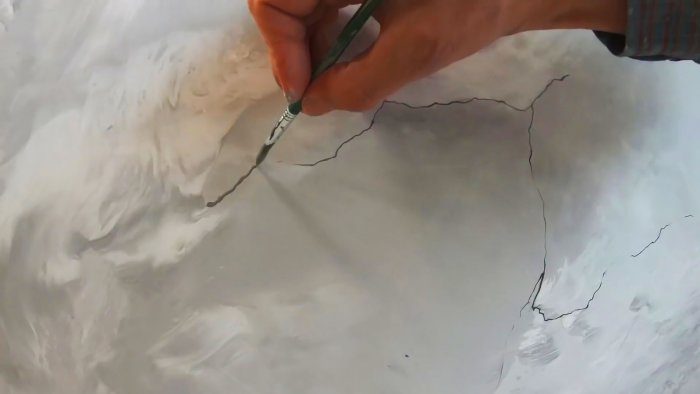 На отполированной стене можно используя тонкую художественную кисть нарисовать прожилки. Для этого используется белая краска с черным колером. Можно также развести в воде штукатурку и подкрасить ее пигментом, будет такой же результат.
